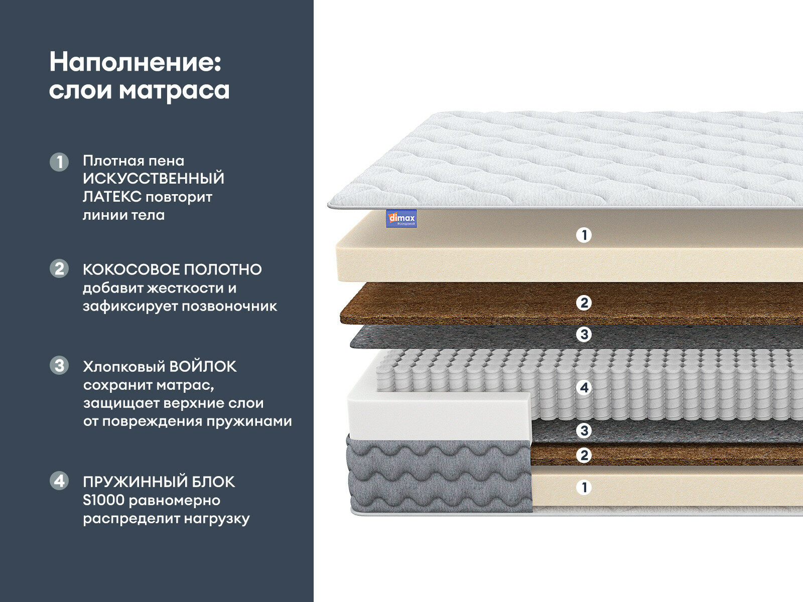 Димакс Биг Хард Базис — матрас усиленный, многослойный, разработанный для тех, кто ценит комфортный сон и долговечность материалов. Сочетание латекса, кокосовой койры и блока S1000 создаёт основу, устойчивую к нагрузкам до 140 кг на спальное место.