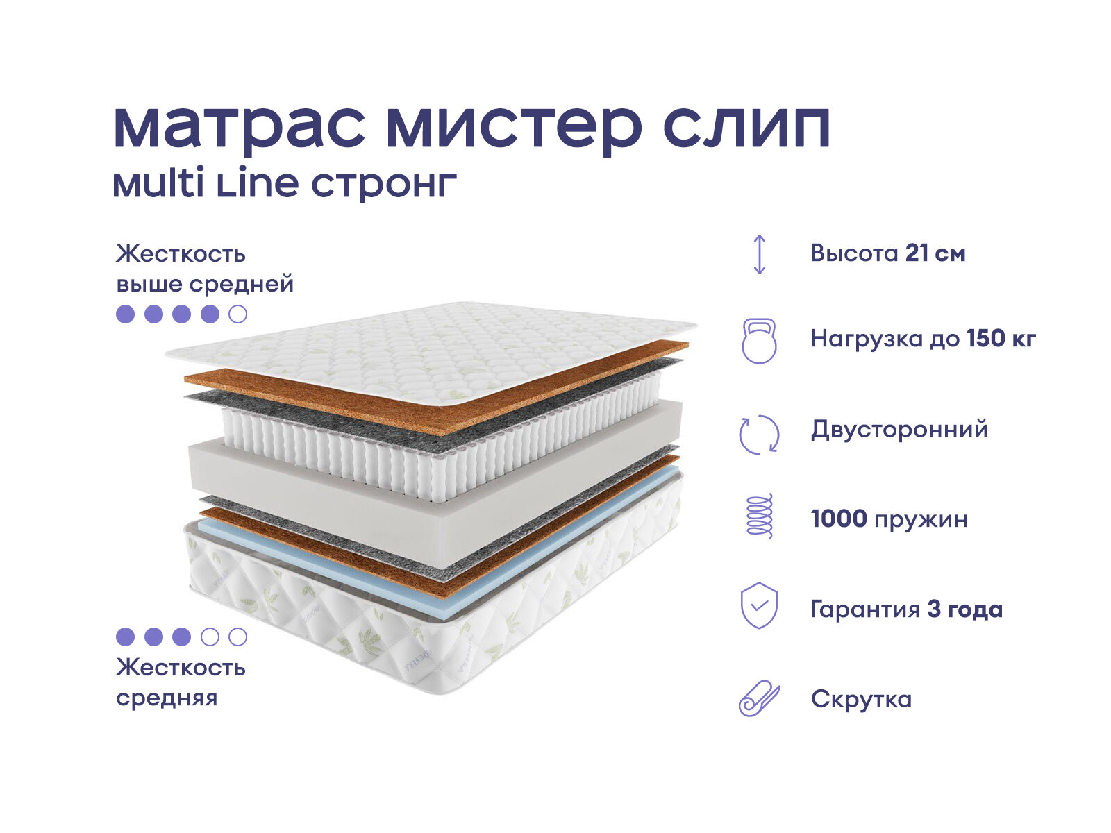 Практичный устойчивый матрас с двумя уровнями жёсткости и усиленной поддержкой. Модель создана для комфортного сна с учётом анатомии тела. Усиленный пружинный блок с 1000 независимых пружин на спальное место и натуральные наполнители обеспечивают надёжную поддержку и долговечность, выдерживая нагрузку до 150 кг на спальное место.