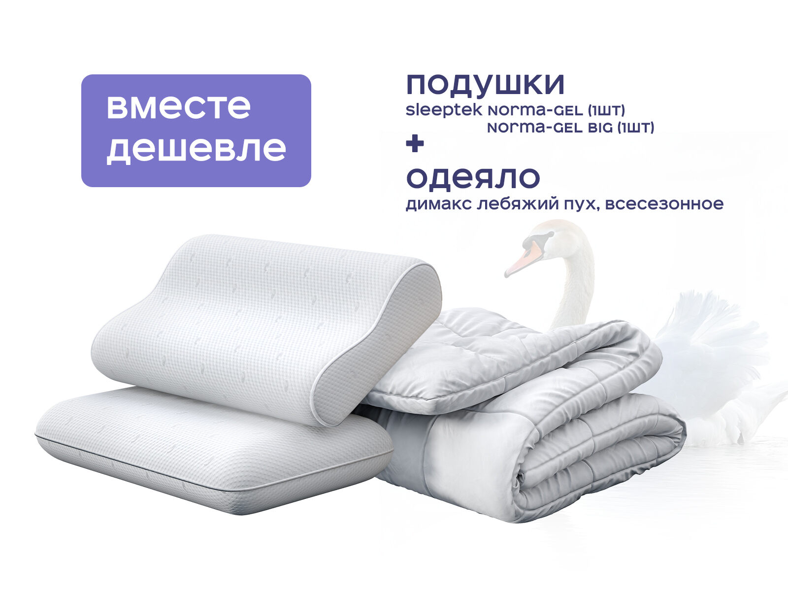 Комплект одеяло Димакс Лебяжий пух всесезонное + подушка Sleeptek Norma-GEL 1 шт. + подушка Sleeptek Norma-GEL BIG 1 шт. — ваш персональный набор для идеального сна, где каждая деталь адаптируется под ваши потребности. Покупая набор, вы экономите до 40%, получаете гипоаллергенное одеяло с климат-контролем и две подушки с охлаждающим гелем разного размера, создавая условия для глубокого восстановления. Больше не нужно выбирать между компактностью и простором — этот комплект предлагает и то, и другое.