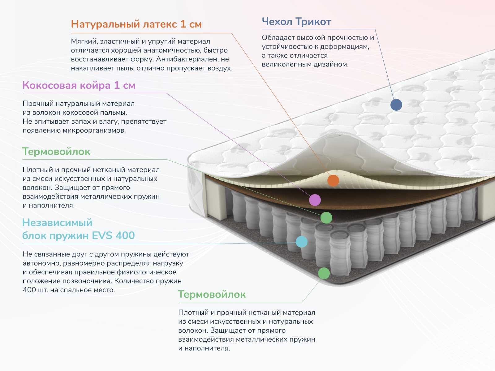 Спальное место содержит около 400 независимых пружин. Автономная работа делает все элементы своеобразными точками опоры и поддержки. В результате формируется ортопедическая подстройка матраса, которая обеспечивает здоровый и благополучный сон.