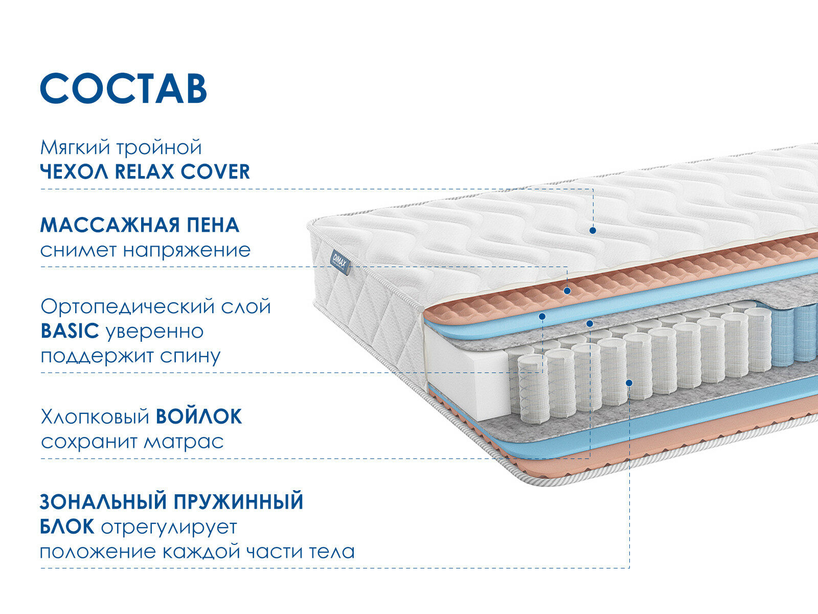 В меру мягкий матрас Димакс Relmas Foam 3Zone сочетает массажный эффект и анатомически корректную поддержку. Модель построена на независимом пружинном блоке с зональной системой распределения нагрузки.