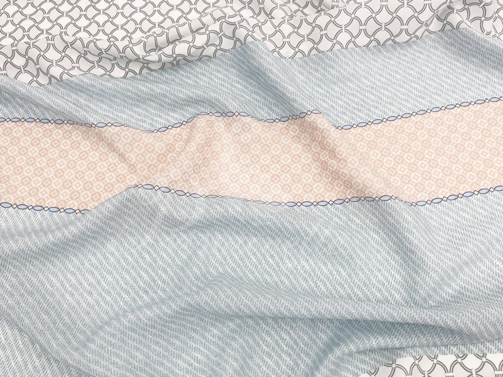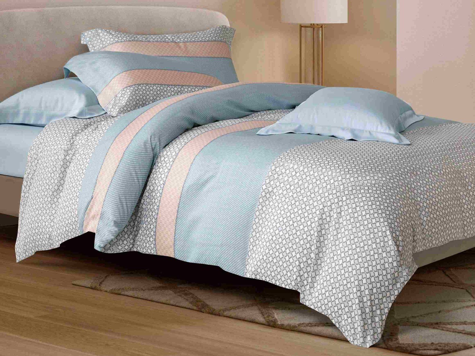 Геометрический орнамент дизайна Kelvin, выполненный в свежей кремово-голубой гамме, наполнит спальню энергией, создаст настроение на весь день.