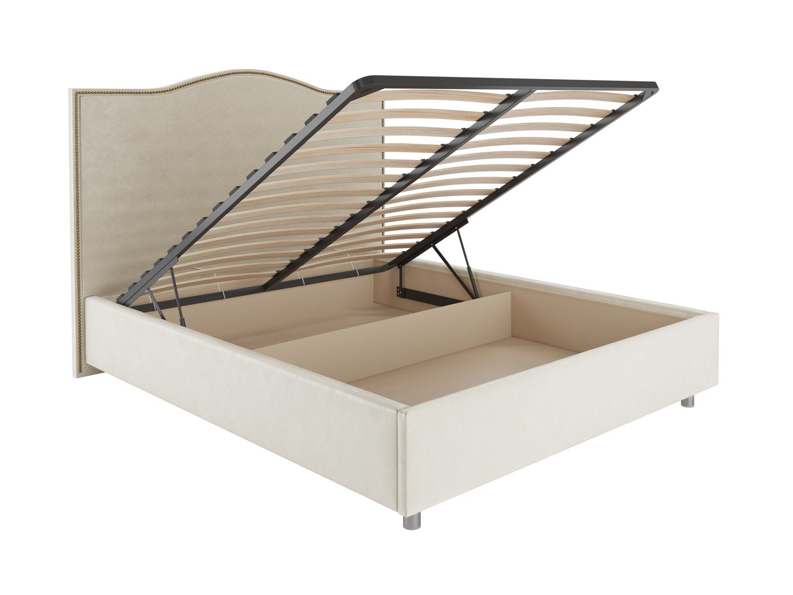 Кровать комплектуется металлическим основанием с подъемным механизмом, под которым находится вместительный бельевой ящик для хранения сезонных вещей и постельных принадлежностей.