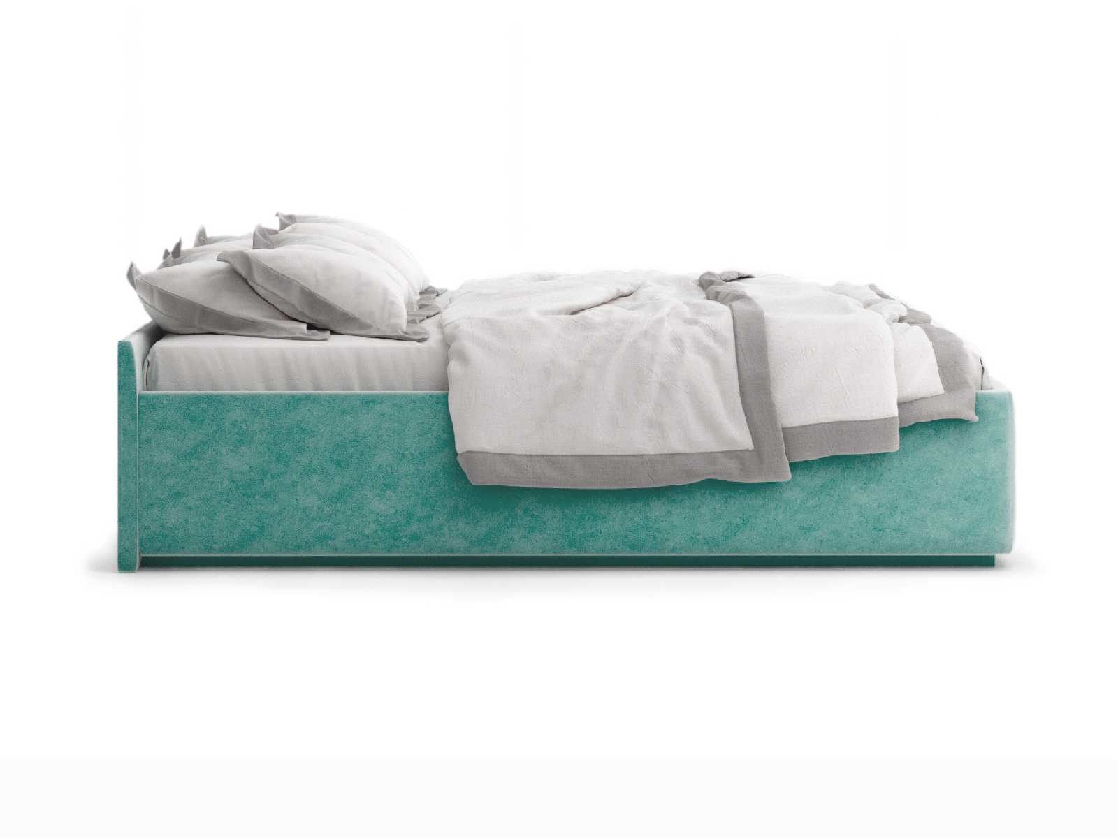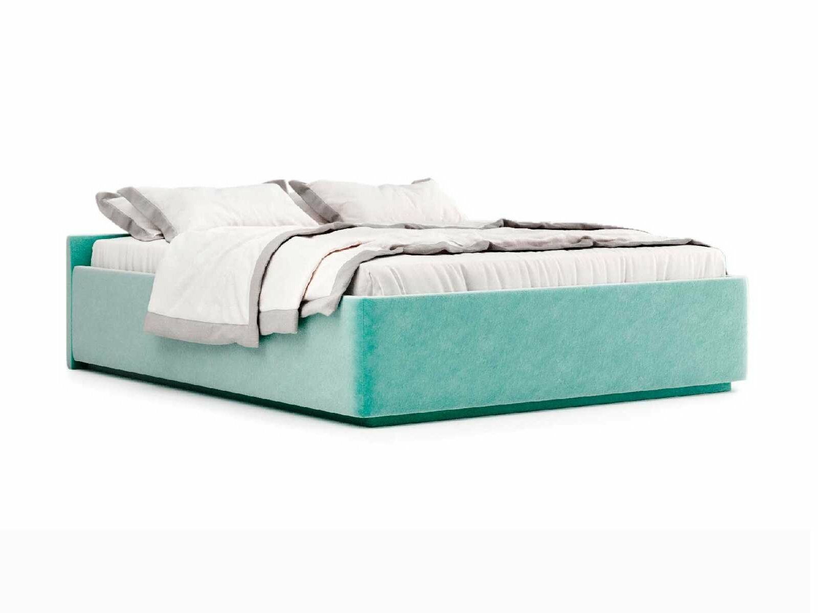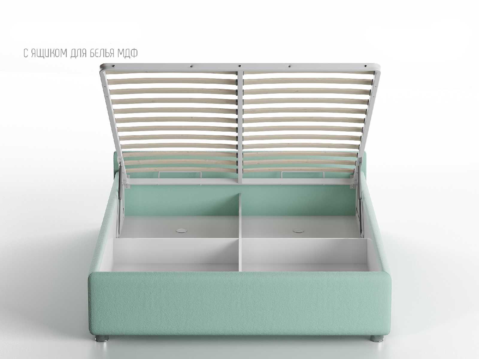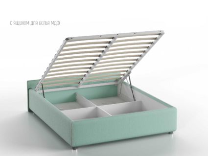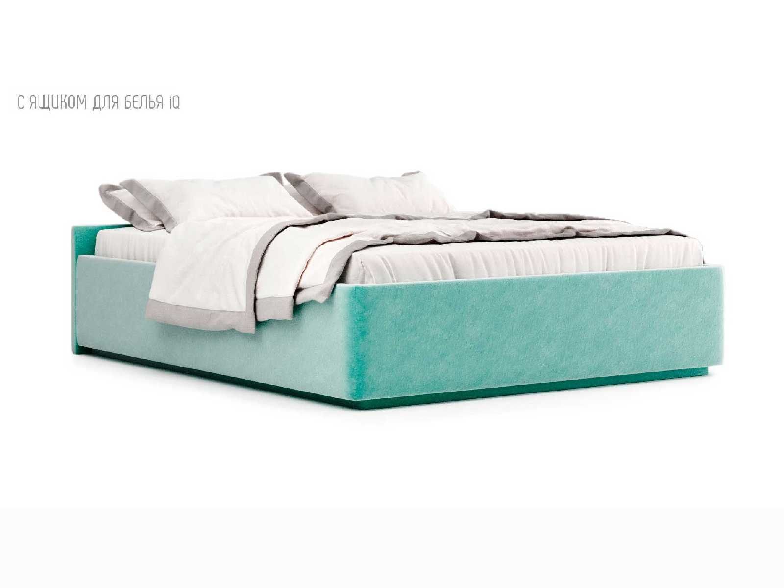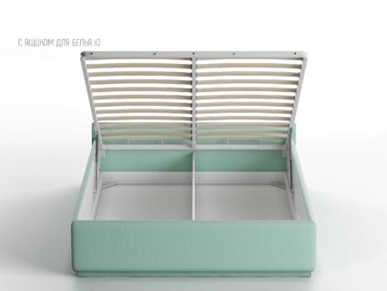 Кровать укомплектована IQ с подъемным механизмом и ящиком для белья без дна (дополнительная платная опция - дно к ящику IQ из HDF (ХДФ). Каркас кровати на цоколе, декоративный чехол на цоколе съёмный. Глубина ящика для белья - 30 см, без ограничения нагрузки на ящик.