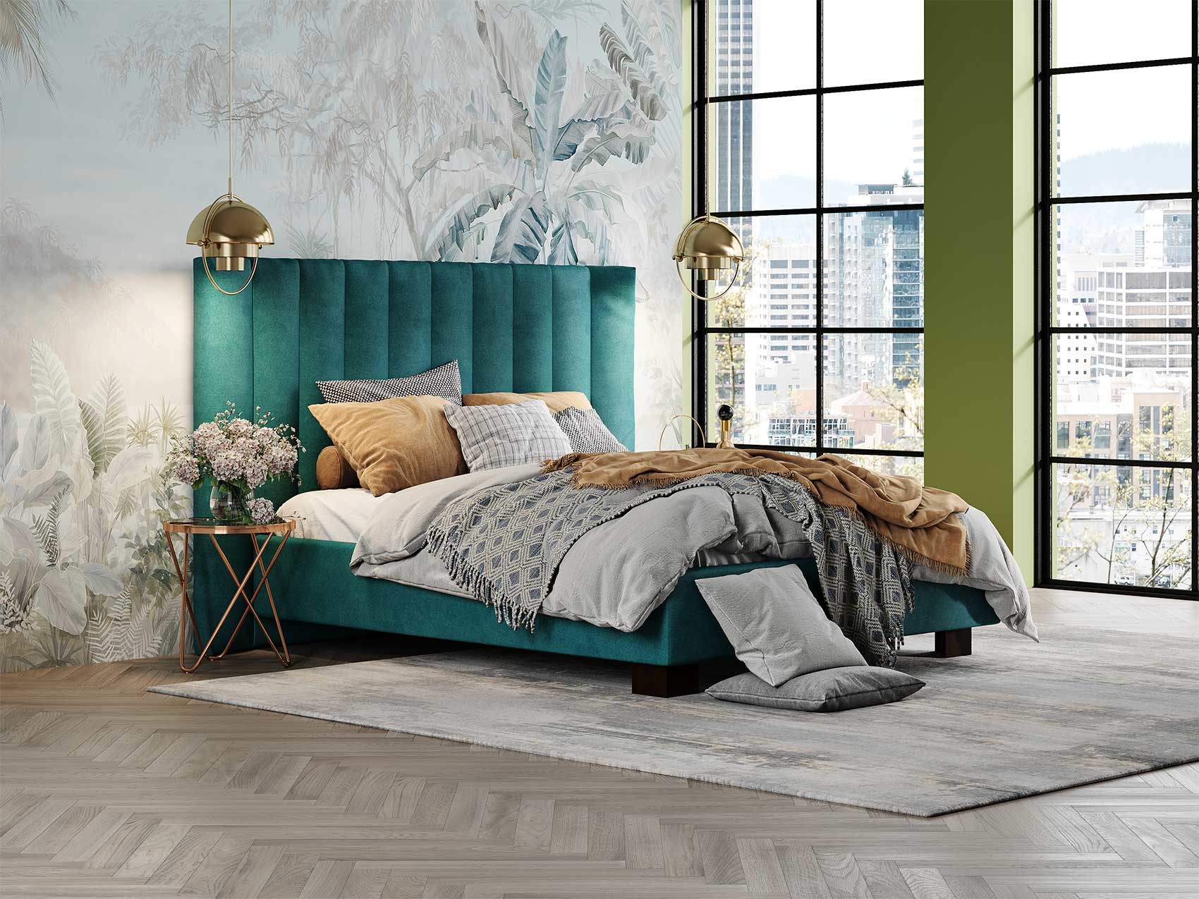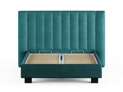 Кровать соответствует самым модным тенденциям и прекрасно впишется в современный интерьер просторной спальни. Высокая спинка с мягкими элементами выглядит эффектно. Поворотный механизм боковых элементов изголовья меняет форму, создавая более уютную атмосферу в спальне. Увеличенная прочность кровати достигается за счет металлического каркаса по периметру. Массивные ножки, выполнены из бука цвета венге. Расстояние от пола до царг способствует легкой уборке под кроватью, в том числе роботом – пылесосом. При желании возможно установить подъемный механизм с бельевым коробом либо трансформируемое основание Aquarius.