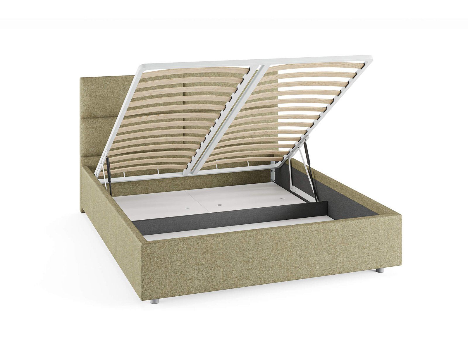 Кровать комплектуется металлическим основанием и подъемным механизмом со вместительным бельевым ящиком. Дно бельевого ящика легко сдвигается для обеспечения уборки под кроватью.