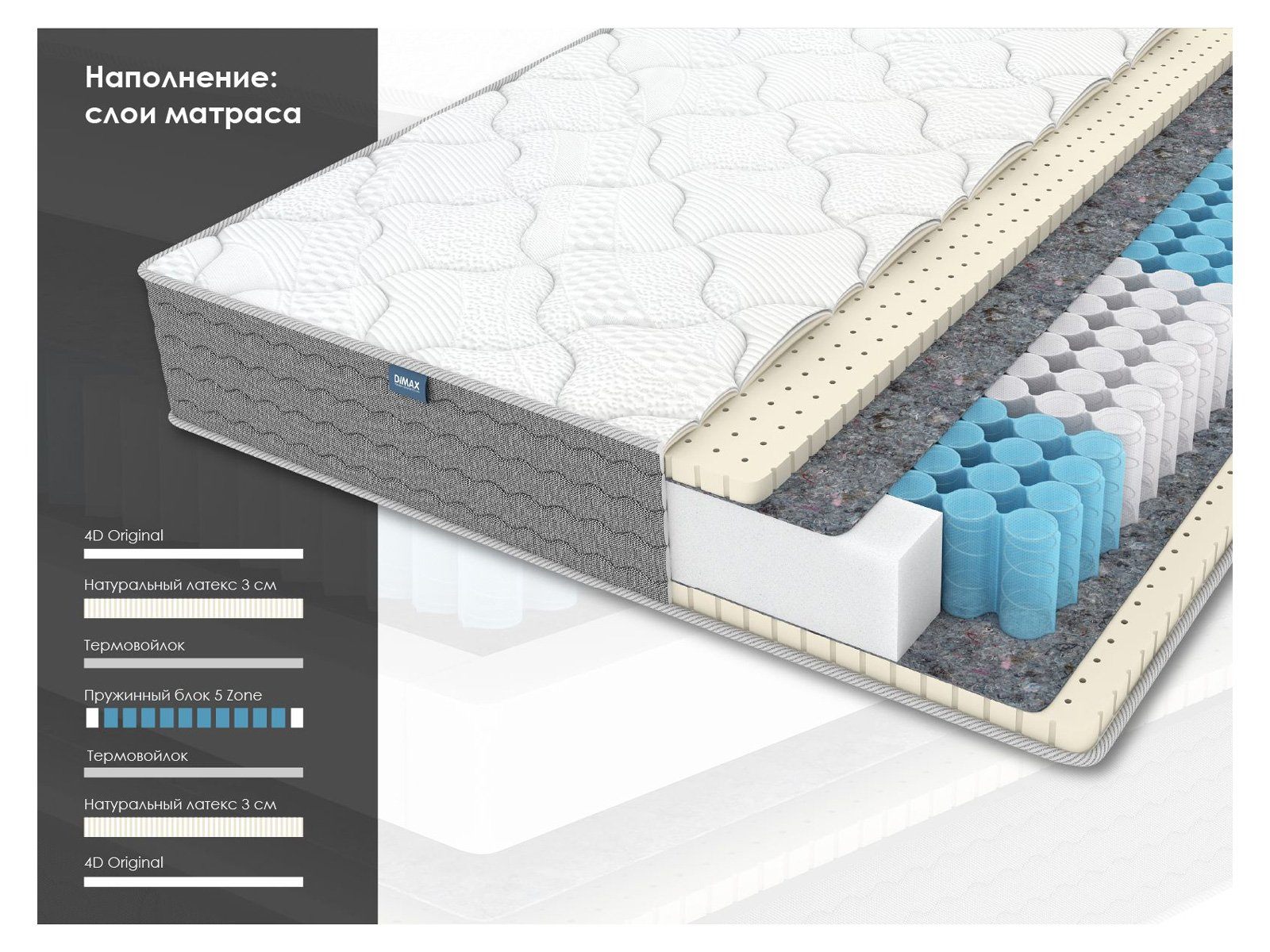 Димакс ОК Софт – самый мягкий матрас в серии «ОК», где комфорт и уют достигают максимального уровня. В основе лежит независимый блок 5 Zone, усиливающий ортопедический эффект, а с обеих сторон изделие снабжено слоями натурального латекса, который даёт удивительную мягкость и анатомическую подстройку под силуэт тела.
