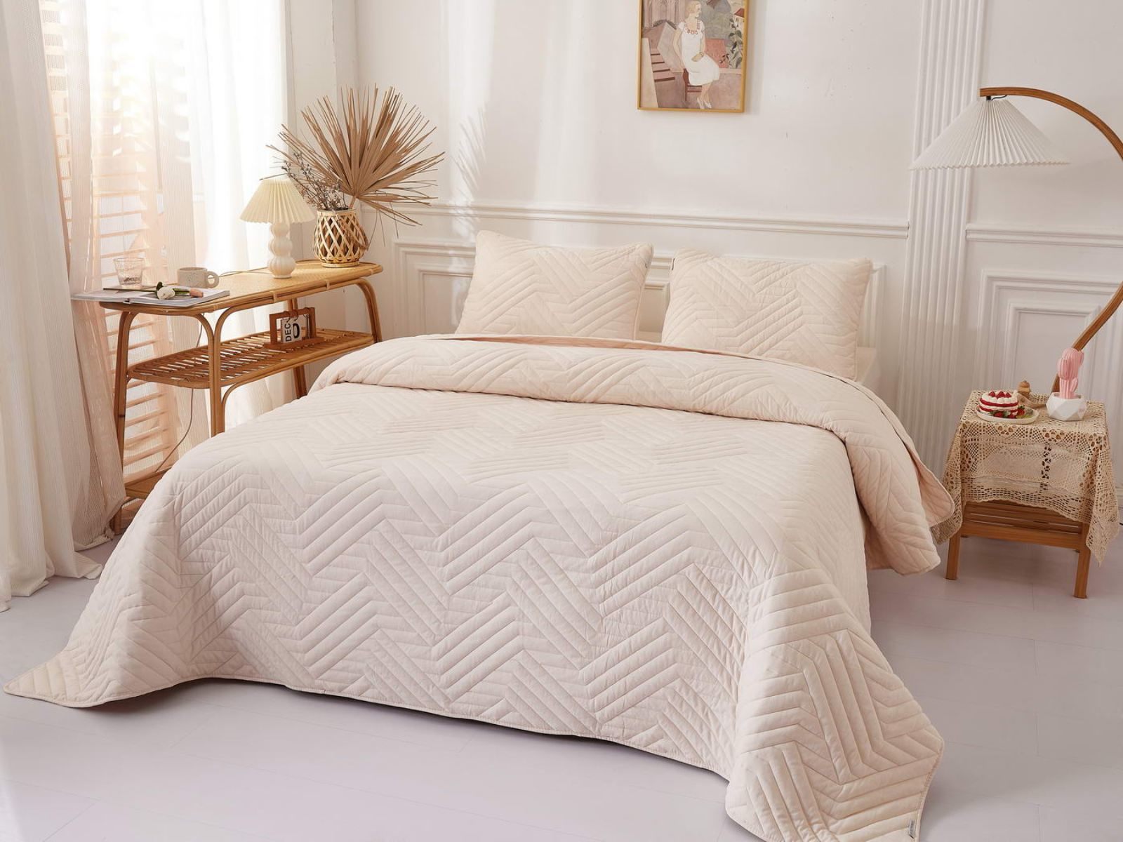 В комплект входят покрывало и одна либо две наволочки (50х70 см) из аналогичного материала в зависимости от размера. Изделия гипоаллергенны, они подходят детям и людям с чувствительной кожей. Покрывала и наволочки не линяют, сохраняют форму и цвет при многочисленных стирках и не выгорают на солнце. Изделия можно стирать в щадящем режиме при температуре не выше 30 градусов.