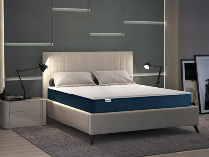 На матрас надет стильный двуцветный чехол с синим бурлетом. Спальные поверхности получили нежную трикотажную обивку со стёжкой по синтепону для мягкости.